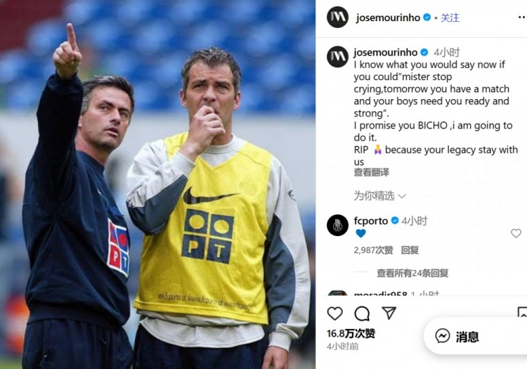 穆里尼奥写道:“我知道,如果你现在还能说话,你一定会说:‘教练,别哭了,明天还有比赛,你的孩子们需要你振作、坚强。’我向你保证,Bicho(野兽),我一定会做到的。安息吧,你的精神将永远与我们同在。”