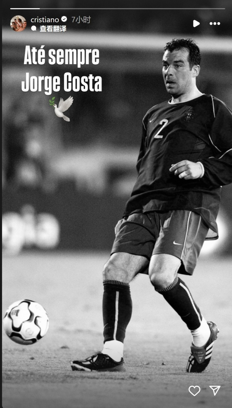 C罗社媒晒出若热·科斯塔球员时代的黑白照片,配文:“永别了,若热·科斯塔”